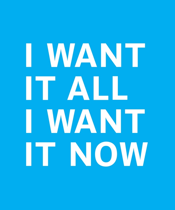 I WANT IT ALL I WANT IT NOW 2018, blue and white poster, ink on paper, 22 x 18 inches