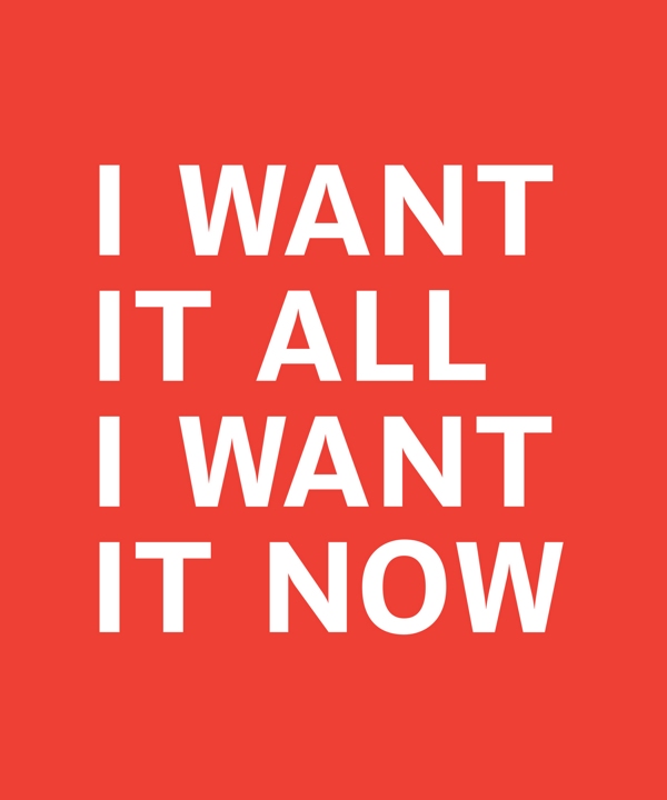 I WANT IT ALL I WANT IT NOW 2011, red and white poster, ink on paper, 22 x 18 inches