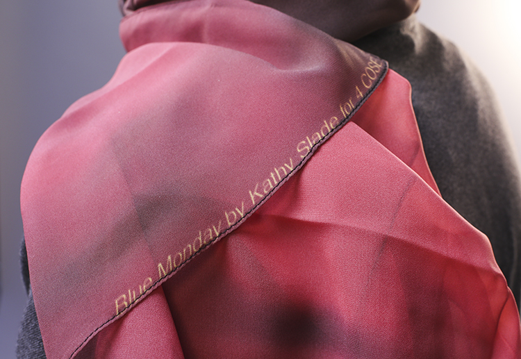 2017, series of four scarves screen printed on silk georgette in multiple, site-specific installation for 4Cose in London, UK. 4 COSE is an ongoing project of artists Charlotte Cullinan and Jeanine Richards. It is an artwork that functions as a grocery store.
